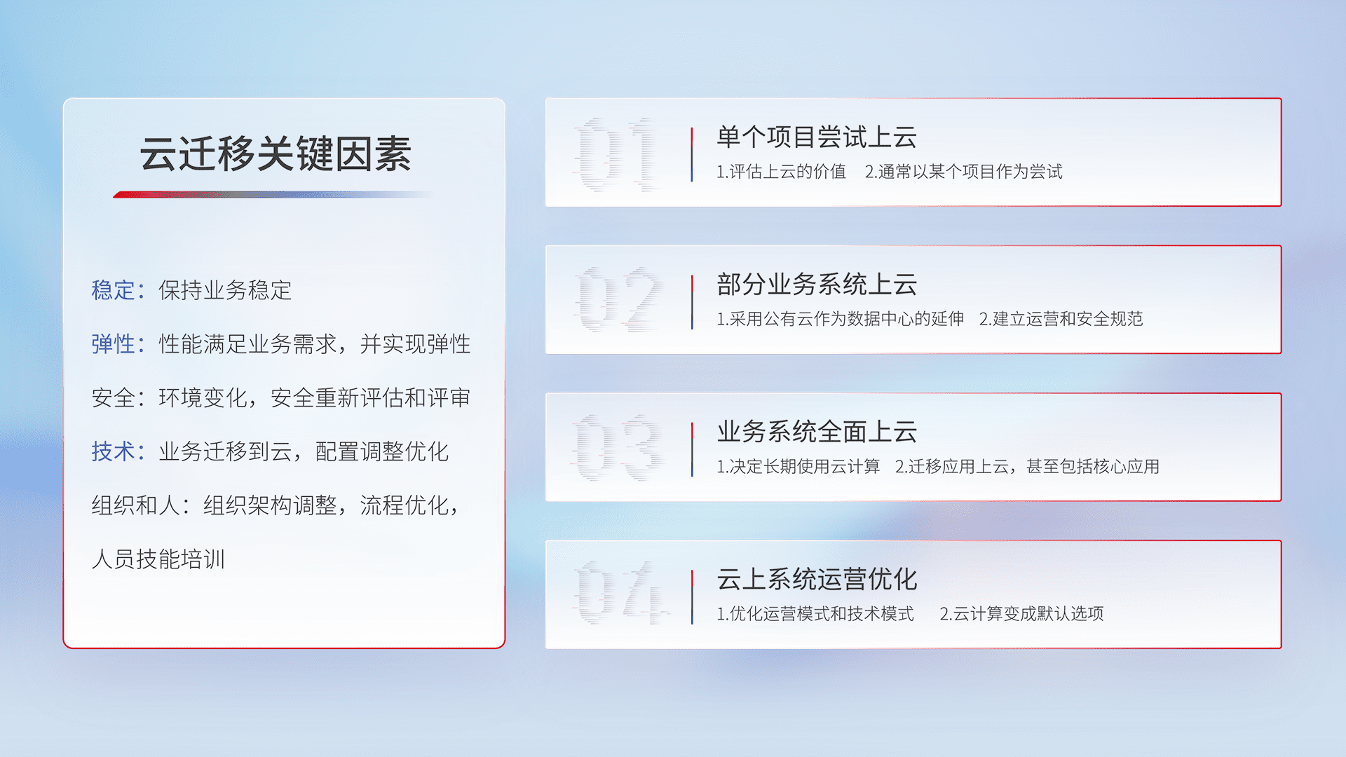 结合实际业务,,,从规划设计、、云平台选型、、、、云原生改造、、、、数据迁移、、、、集成交付,,,,迁移全过程为客户识别最佳上云路径,,,做好风险识别管理,,设计网络架构、、、身份权限、、、安全审计合规、、操作审计、、、、日志审计、、、监控告警策略、、多站点容灾设计等,,对云上基础设施进行整体规划,,,,提升IT治理水平,,,,以满足弹性、、高可用、、、高性能的需求。。。。